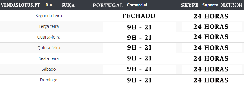 Atenção o nosso departamento comercial só funciona dentro do horário assinaldo na tabela. O nosso departe de suporte é feito via skype e djlotus2014. Atenção skype poderam demorar entre 10 a 15 minutos a serem respondidos dependedo do caso.